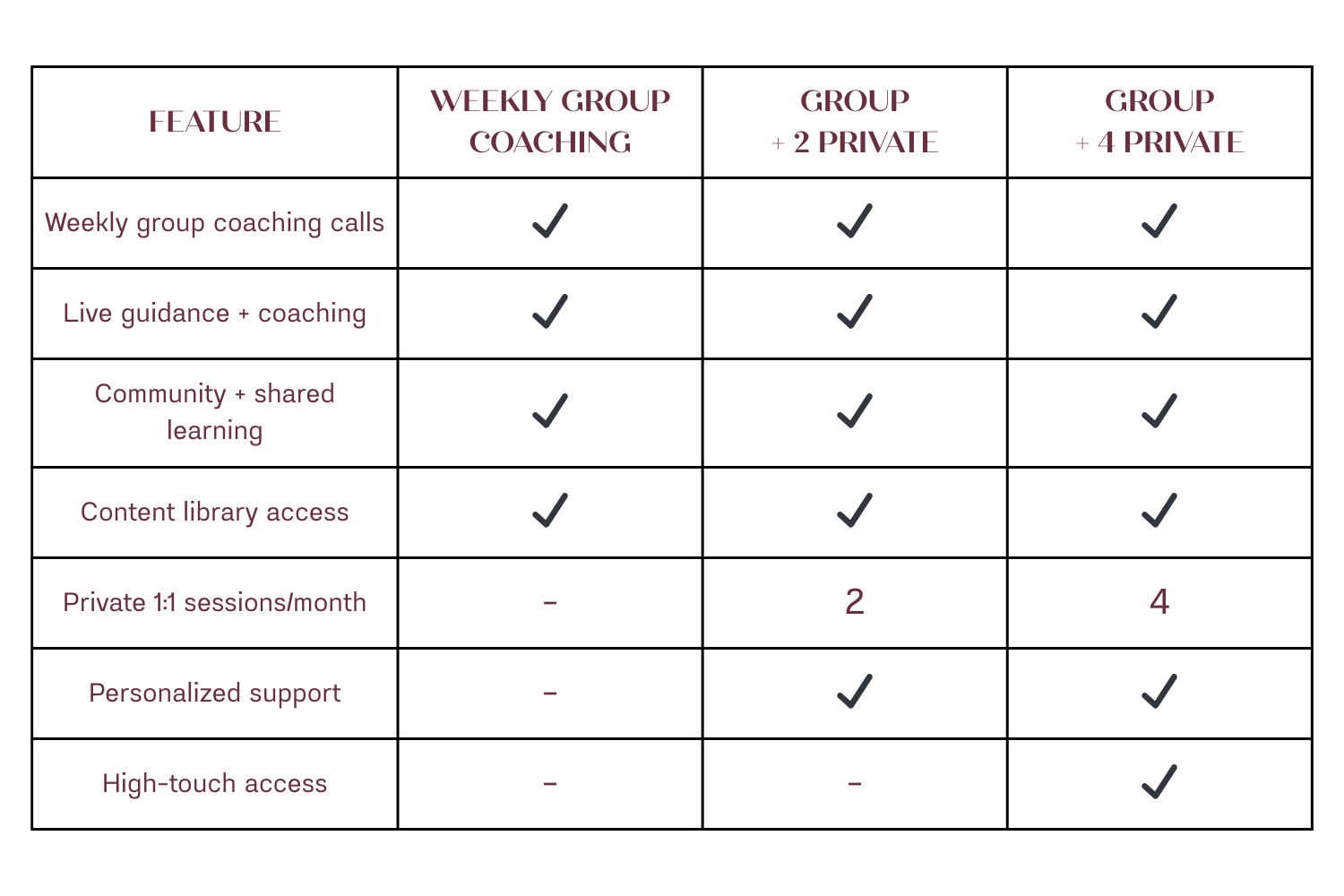 (3 group coaching sessions p/month & content library access & community space for shared learning)